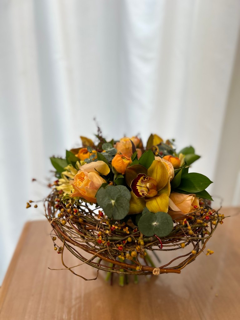 在插花之前,我們先花了一小時,以龍柳做一個圓形的架構 。但其實我一直都不理解,花朿為何要做一個架構…